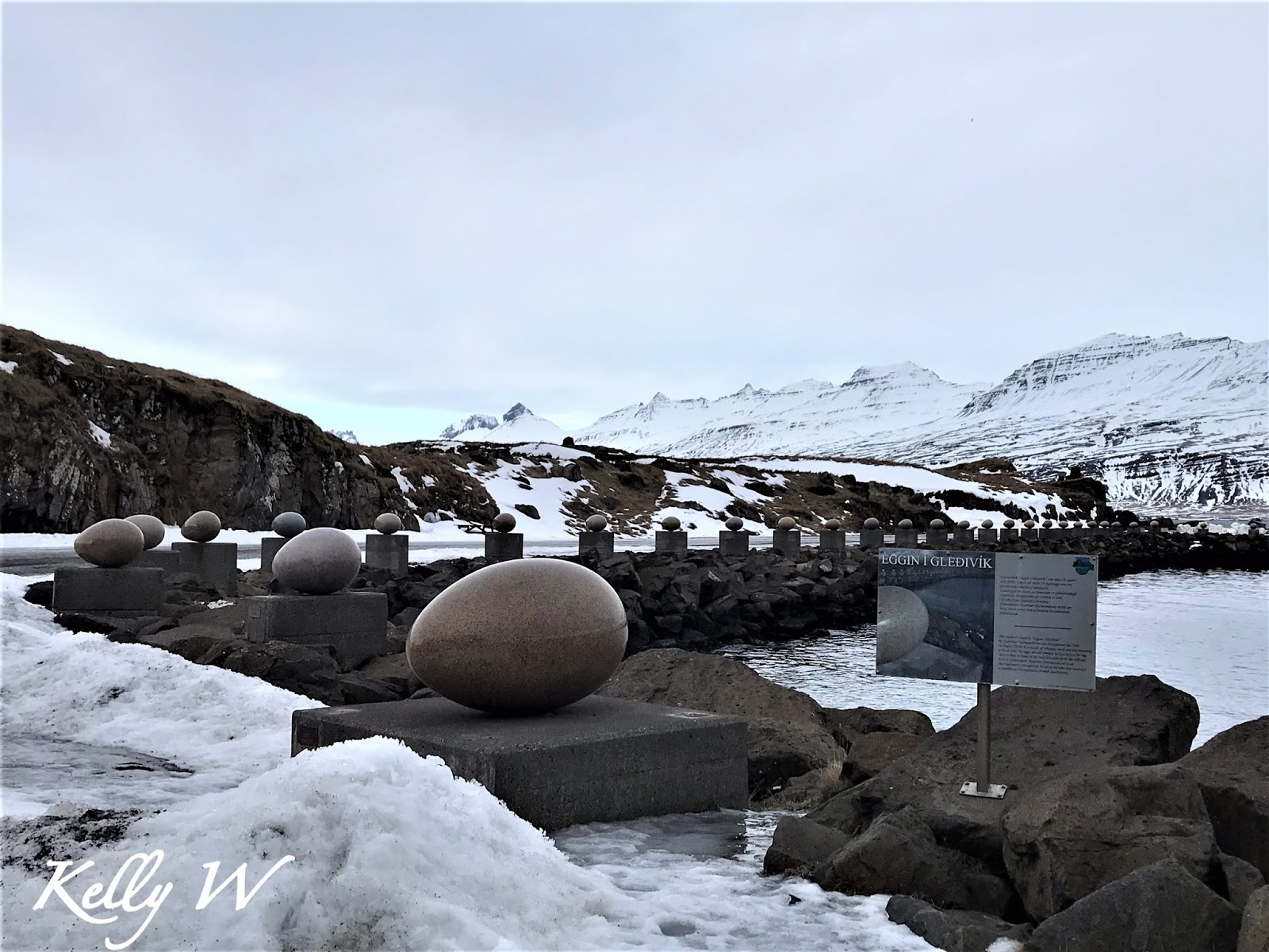 材質是中國進口的花崗岩所作成,仿照不同鳥類的蛋形狀去做的,都是當地的鳥類物種,一共有34顆,每一顆蛋上都有標明是何種鳥類的蛋,這麼冷的天氣這些蛋應該孵不出鳥來,哈哈。神秘的金字塔山『 Búlandstindur 』,據說想看到神山的盧山真面目可是要配合天氣,我們來的這天雖然天氣沒有很好,但神山的樣貌卻異常清晰,整座山被白雪覆蓋,更顯得雄偉。這座標高1069公尺的Búlandstindur神山是當地居民心中的神山,位於Berufjordur峽灣和Hamarsfjordur峽灣之間,